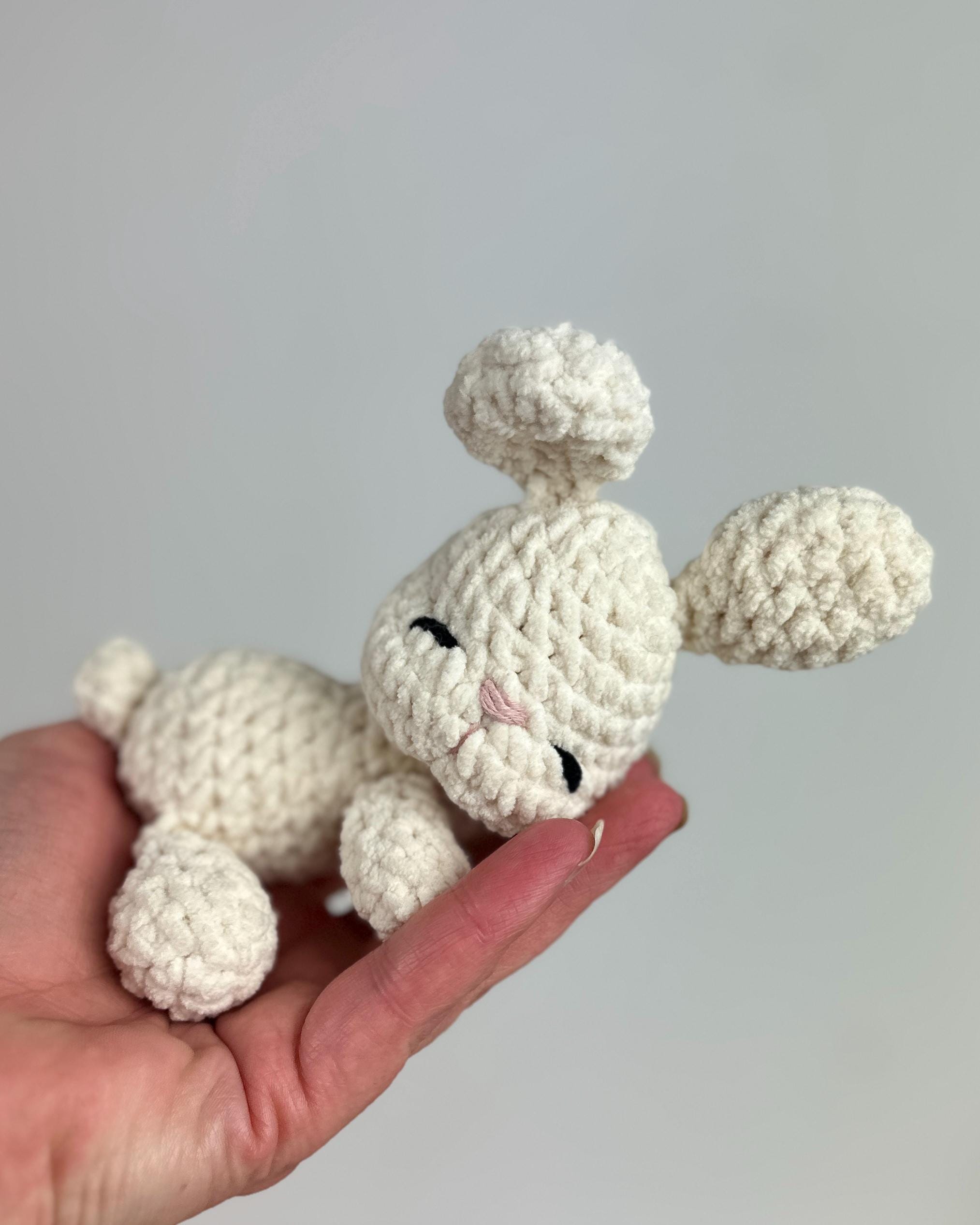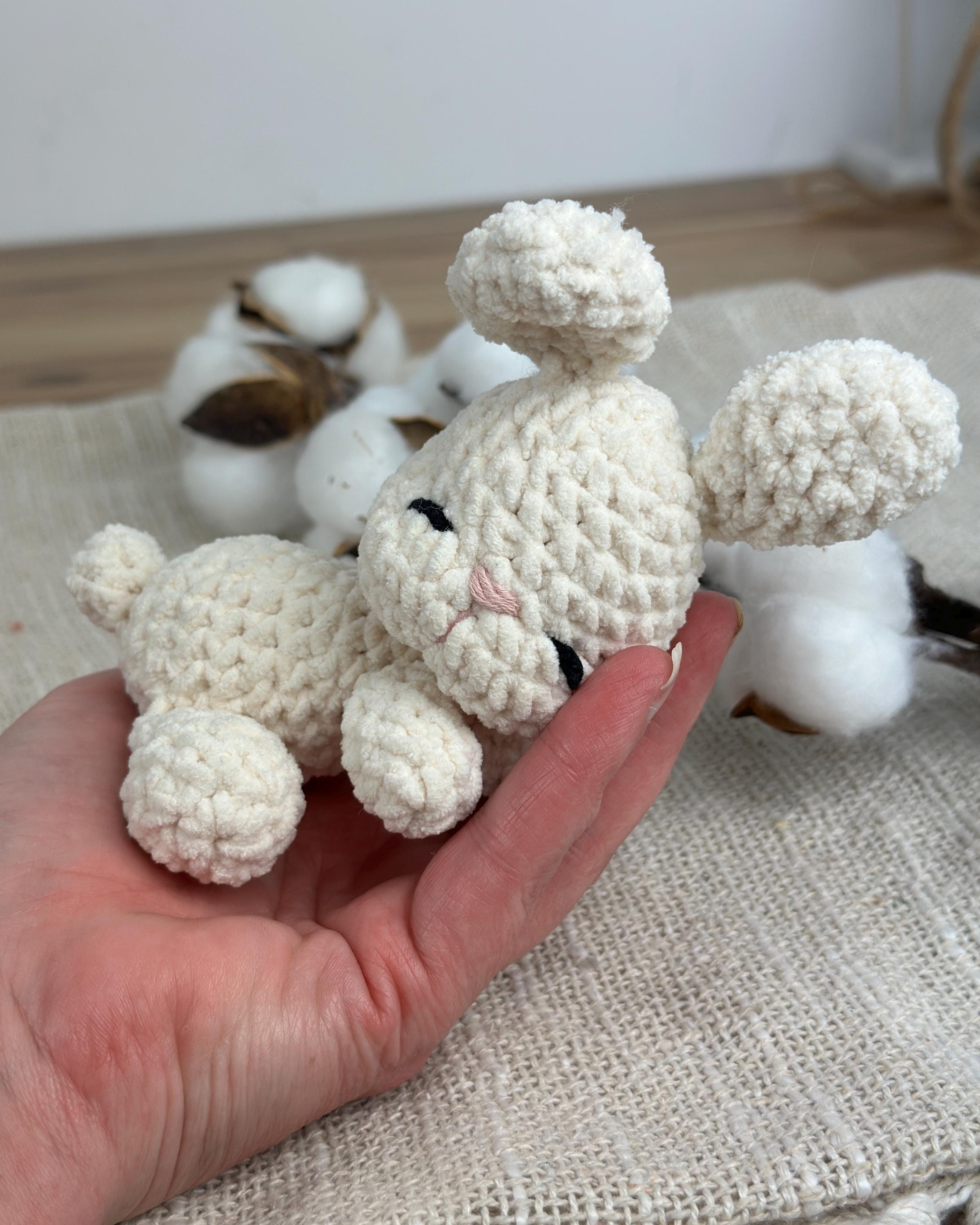 The finished plushie has a sweet, sleepy expression and soft floppy ears — ideal as a bedtime toy, baby shower gift, nursery decoration, or a calming addition to your amigurumi collection.