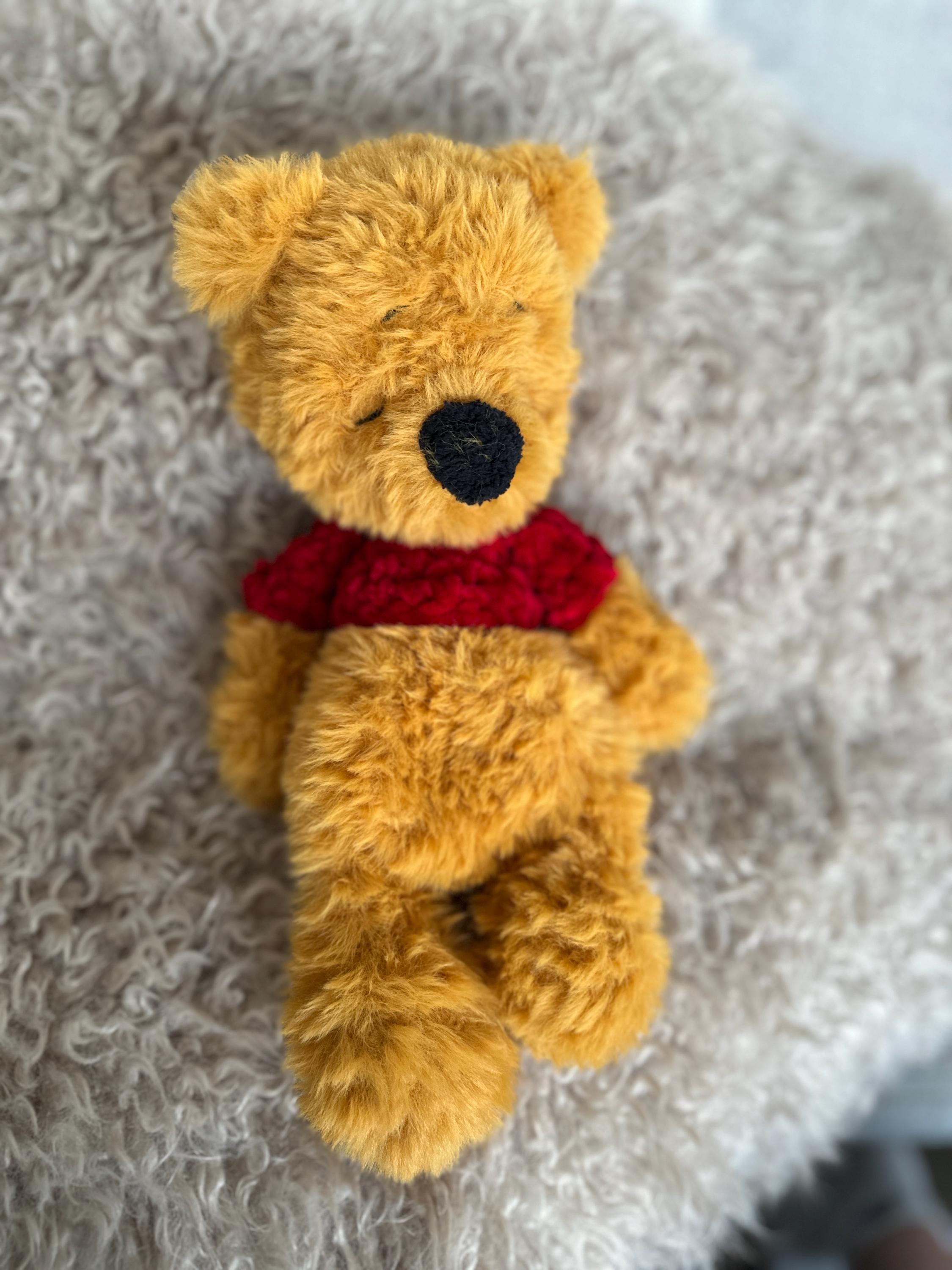 Inspired by a sweet, honey-loving bear from a beloved vintage children's story, this plush design has a warm, timeless charm.