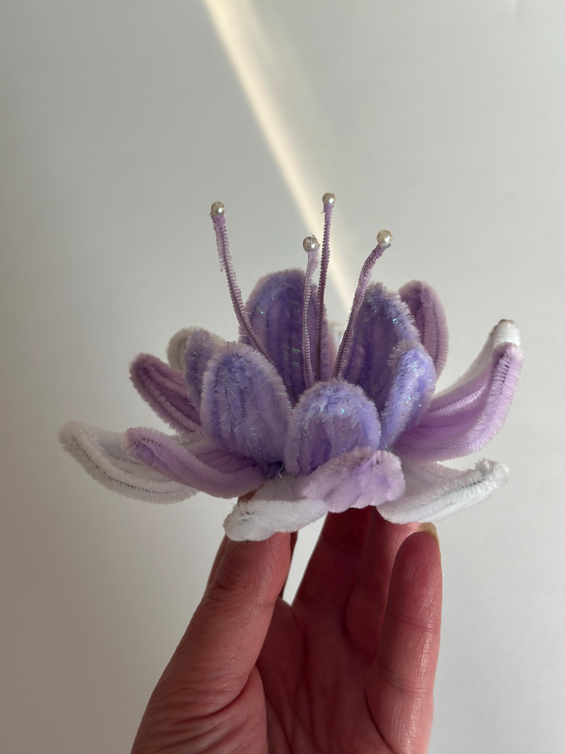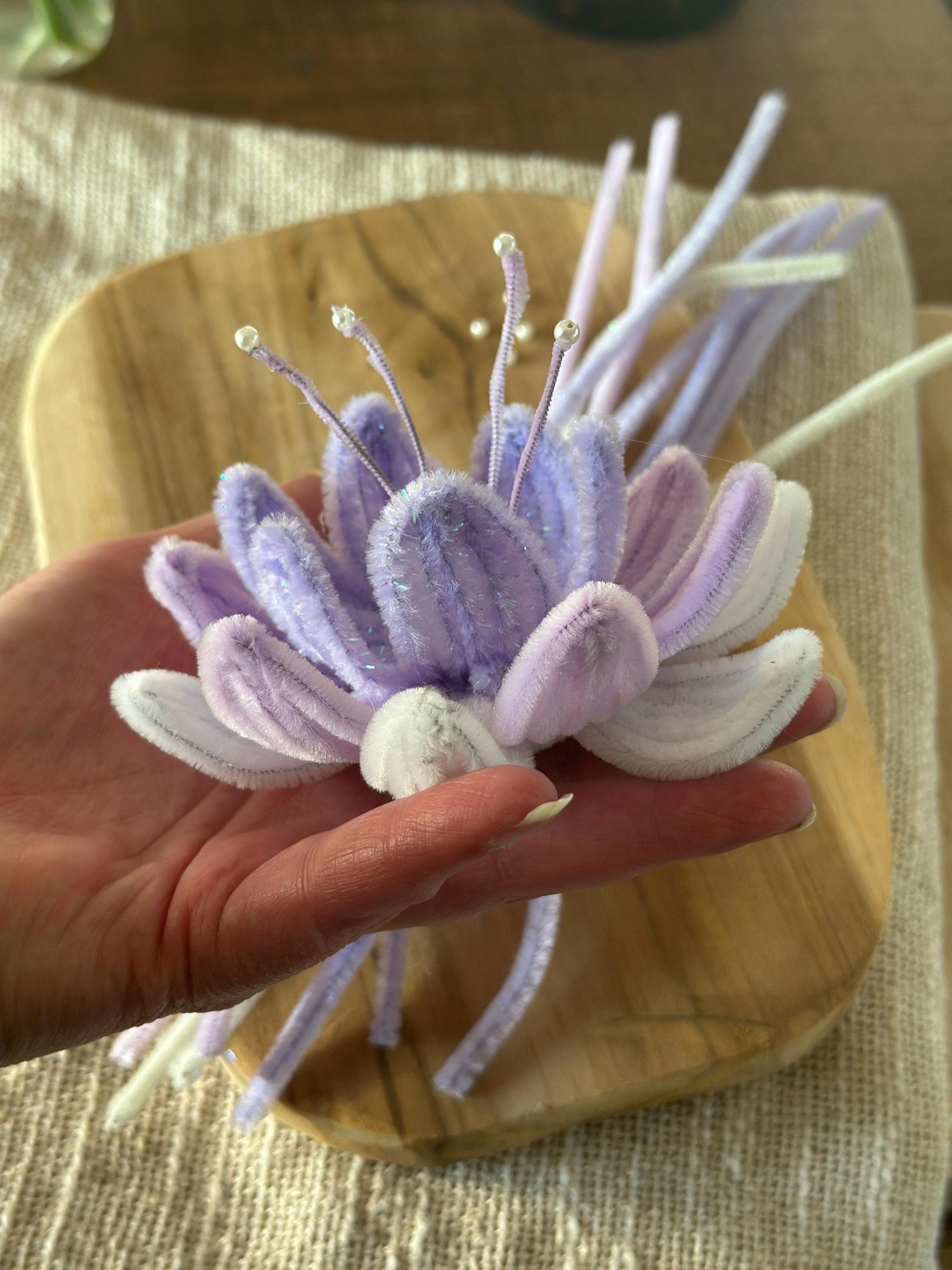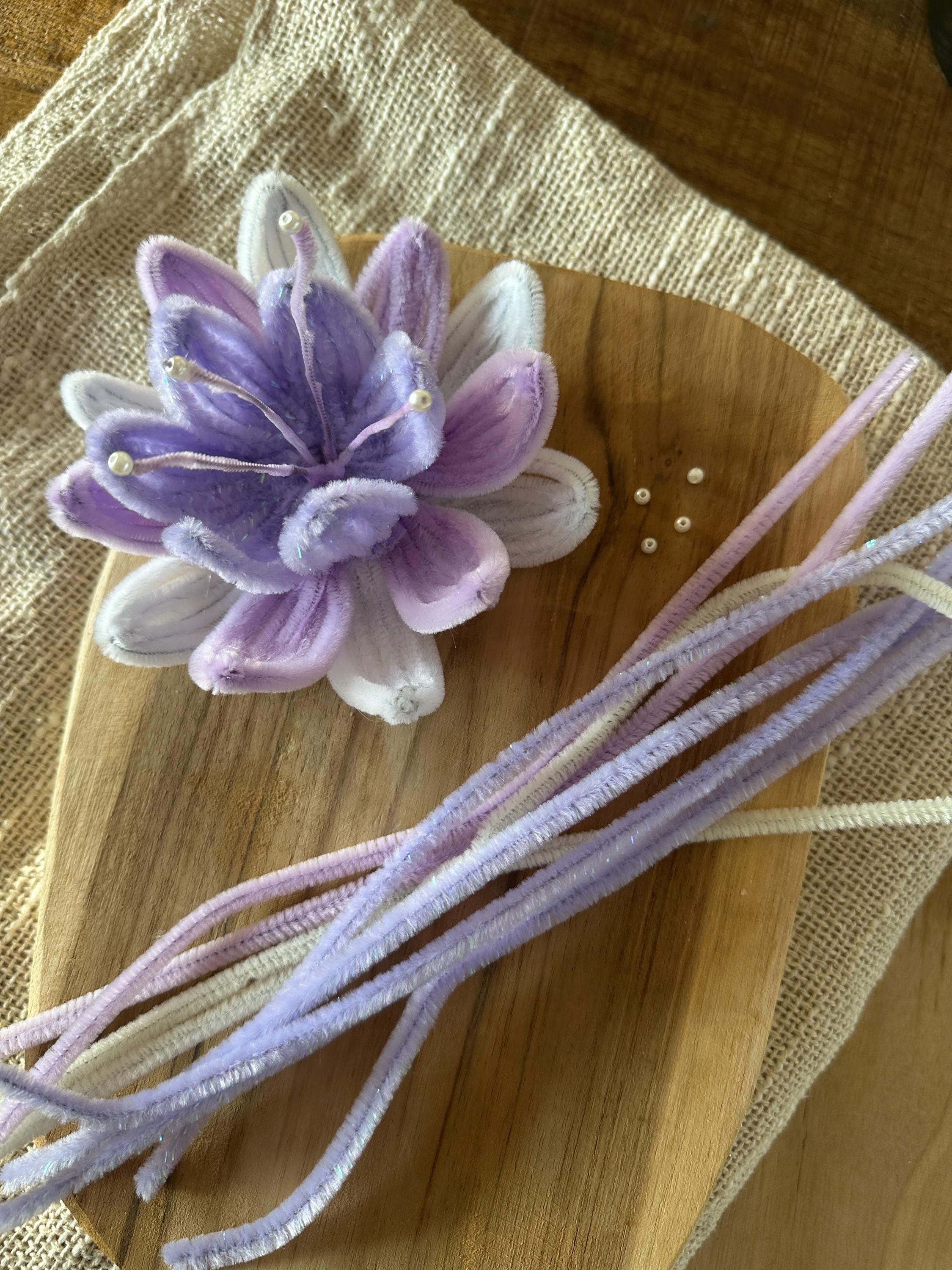 This graceful design is made using soft pipe cleaners (chenille stems), resulting in a delicate flower with a calm, refined and slightly sculptural look.